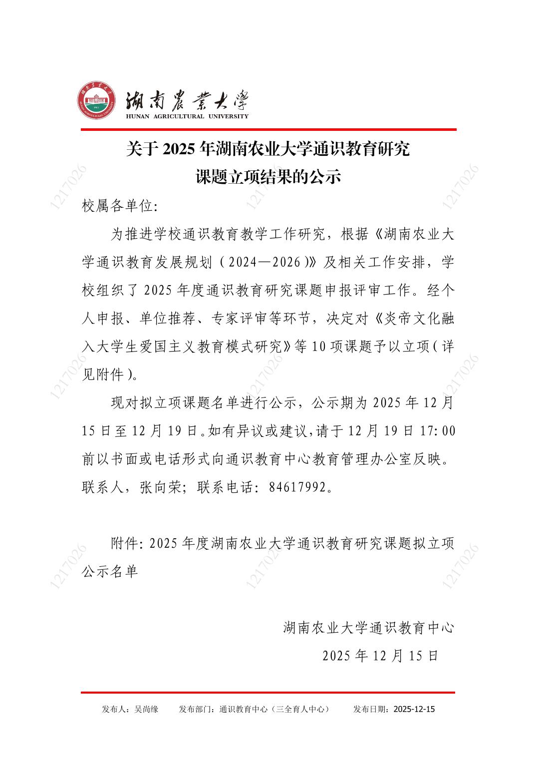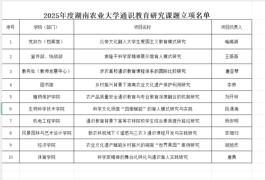 关于2025年湖南农业大学通识教育研究课题立项结果的公示