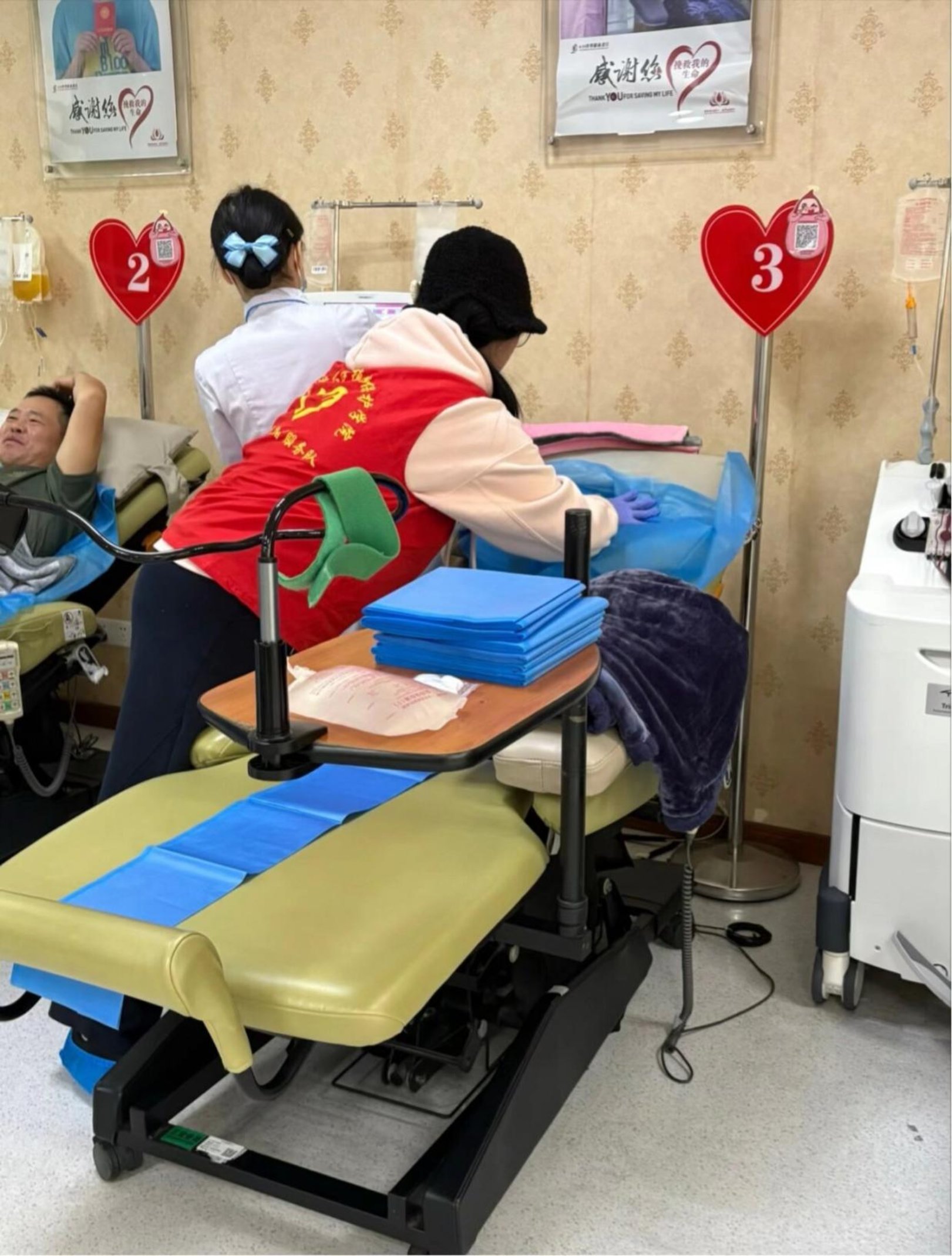 采血过程中,医护人员专业操作,志愿者贴心服务,共同关注献血者的身体状况,及时提供帮助与关怀。