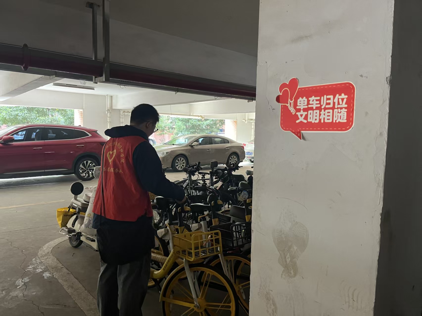 活动中,身穿红色志愿服的志愿者们活跃在校园各个停车区域,分工有序、配合默契。大家将倾倒的共享单车逐一扶起,把随意停放的车辆整齐转移至划定区域,并细心调整车头方向、保持合理间距,使原本杂乱的停车点重现整齐面貌。志愿者们还在疏导整理的同时,主动提醒过往同学有序停车,耐心讲解规范停车对保障通行安全、维护校园环境的重要意义,以言传身教倡导文明出行。