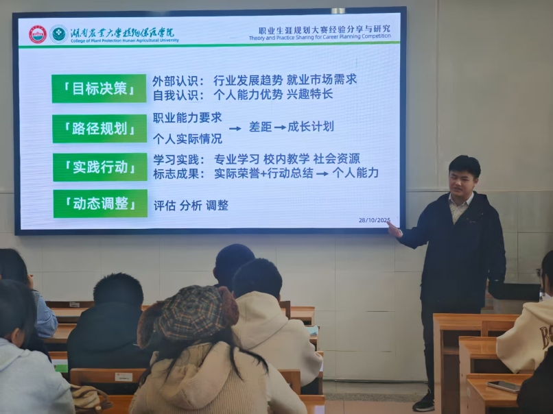 第二届全国大学生职业生涯规划大赛铜奖获奖者——2022级植物保护专业宋嘉瑞同学,分享参赛经验,结合大赛评审要求,介绍了目标决策、路径规划、实践行动、动态调整四大方面内容。在目标决策方面,他建议同学们从内外部两个维度认识自我,关注个人能力、兴趣与优势,把握行业趋势与就业市场需求,从而确立切实可行的职业目标。在路径规划方面,他指出要对照职业要求,分析自身实际情况,明确差距所在,进而针对性地构思成长计划,为实现职业目标铺就可行路径。在此基础上的实践行动,他结合自身参加学术会议、人物访谈、走访调查等经历,鼓励同学们将理论知识转化为实践能力,不断积累经验、拓展视野。在动态调整方面,提醒同学们职业规划需保持灵活性,应根据行业发展与个人成长变化及时调整方向,确保规划始终服务于个人发展需求。