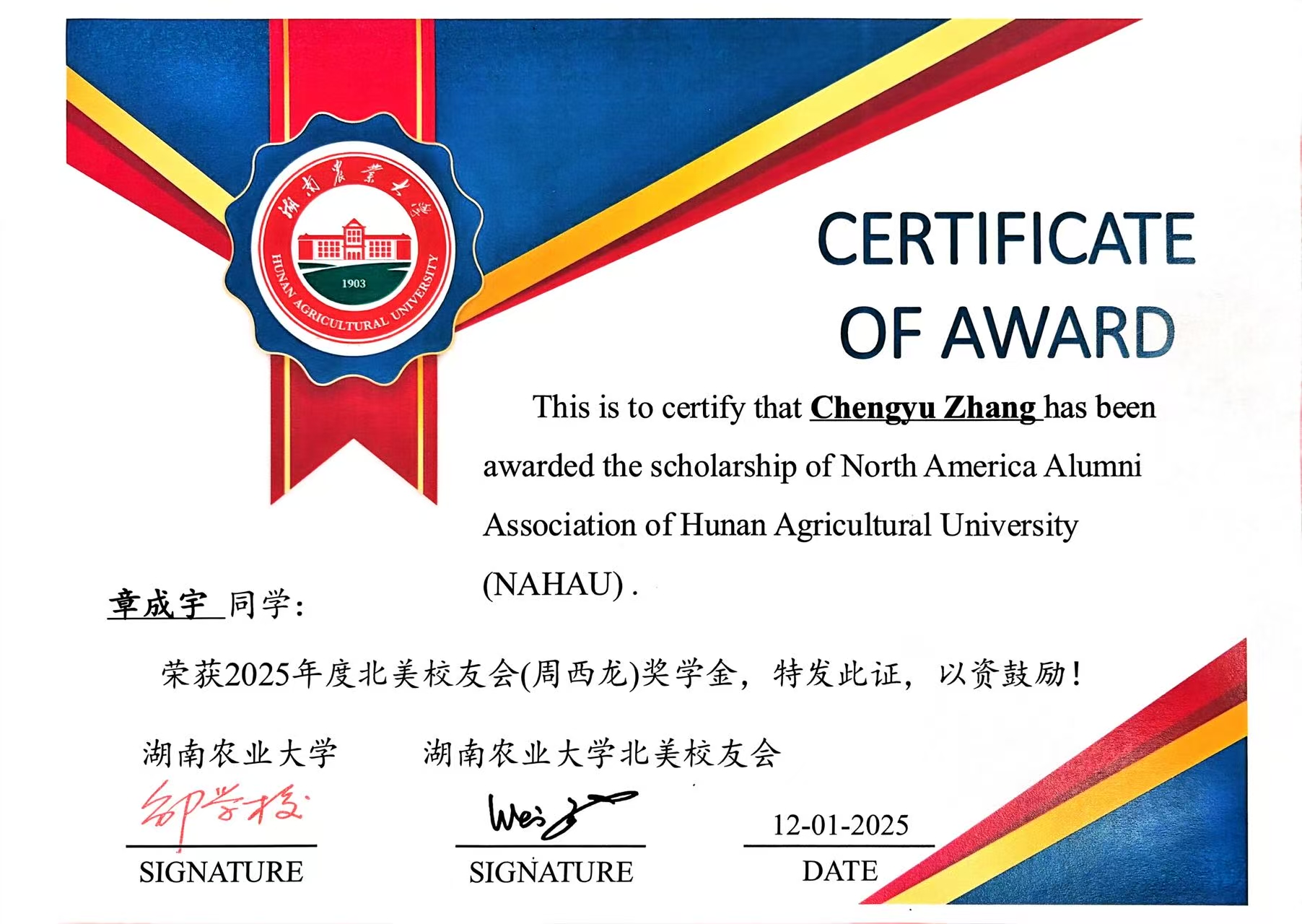 13.荣获湖南农业大学2025年“北美校友会奖学金”