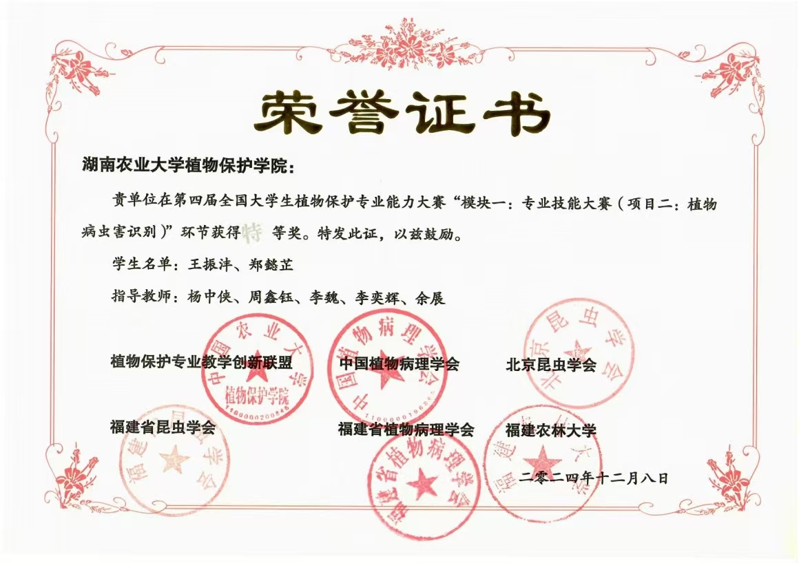 8.荣获2024年第四届全国大学生植保能力大赛“模块一:专业技能大赛(项目二)”特等奖