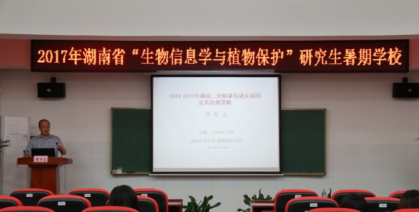 6月29日,湖南省“生物信息与植物保护”研究生暑期学校于湖南农业大学植物保护学院16教529持续进行。湖南农业大学教授丁中、李有志、李明和李大志分别作了“水稻线虫的发生、危害与防治”和“2014年湖南地区二化螟暴发成灾机制及其治理策略”、“农用航空技术的发展”和“科学研究的基本素养——以柑橘研究为例”四场学术报告。报告由植保院党委副书记肖露主持。作为2017年湖南省“生物信息学与植物保护”研究生暑期学校和植保院研究生学术活动节的四场重要报告,来自省内外16所高校的110多位学员和植保院全体研究生前来现场聆听课程。