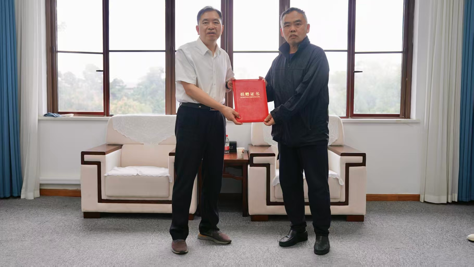 10月13日上午,中国工程院院士、湖南农业大学党委副书记、校长邹学校为1977级植物保护专业杰出校友李一农颁发捐赠证书,对其心系母校、慷慨捐赠的义举致以诚挚谢意。随后,双方一同参观了校园内的“爱心长河”。这道独特的风景线,将无数校友及社会友人的姓名与善举永久铭刻,如长河般记录着拳拳情谊,是母校饮水思源、感恩前行精神的象征。