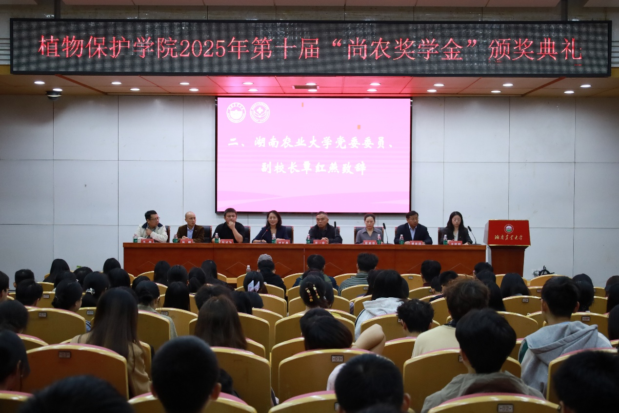 10月14日上午,植物保护学院2025年第十届“尚农奖学金”颁奖典礼在学海厅举行。覃红燕、吴敬东,学校校友事务与发展联络办公室主任彭可为,植物保护学院领导班子和百余名研究生、本科生参加典礼。