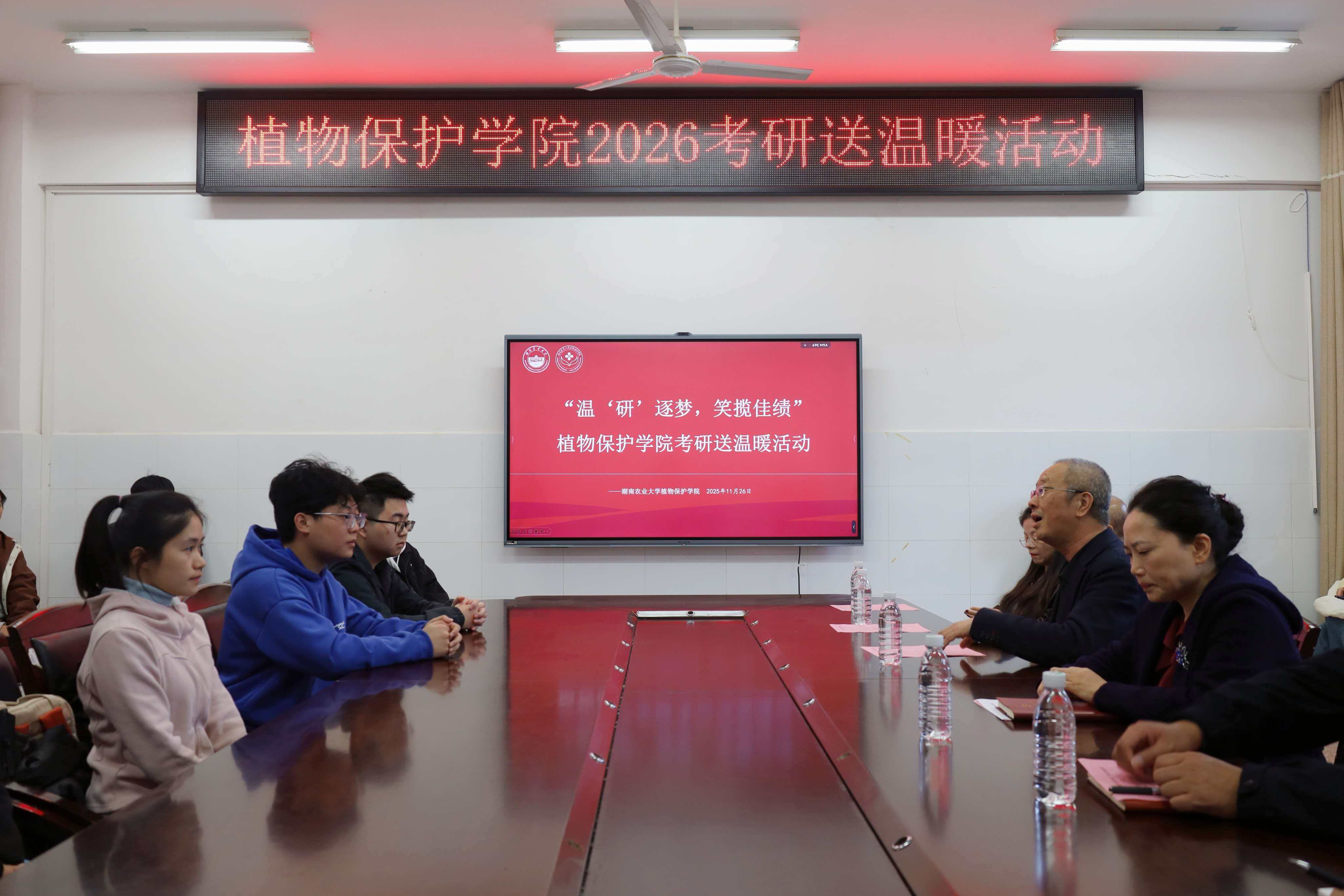 (本网讯 植保学院 金楚轩 王思贤) 11月26日下午,植物保护学院于16教525会议室举办主题为“温‘研’逐梦,笑揽佳绩”的考研送温暖活动。植物保护学院院长李有志、党委书记张素芬、专职组织员林曙、副院长刘双清、副院长李魏、党委副书记余婷婷出席,2022级考研学生代表参加。2022级辅导员李奕辉主持。